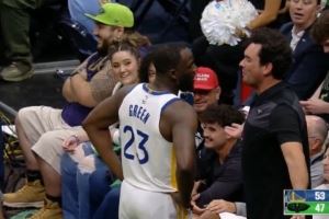场边一位球迷和追梦怼脸发生口角 未被驱逐但被裁判红牌警告