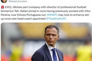 体育资讯11月5日讯 据知名记者奥恩斯坦报道,狼队总监多梅尼科-泰蒂离职。报道称这位意大利总监于今年6月加入球队,此前曾与主帅佩雷拉共事,现在他跟随葡萄牙主帅的脚步离开了俱乐部。狼队可能会在新任主教练确定后进一步调整球队架构。